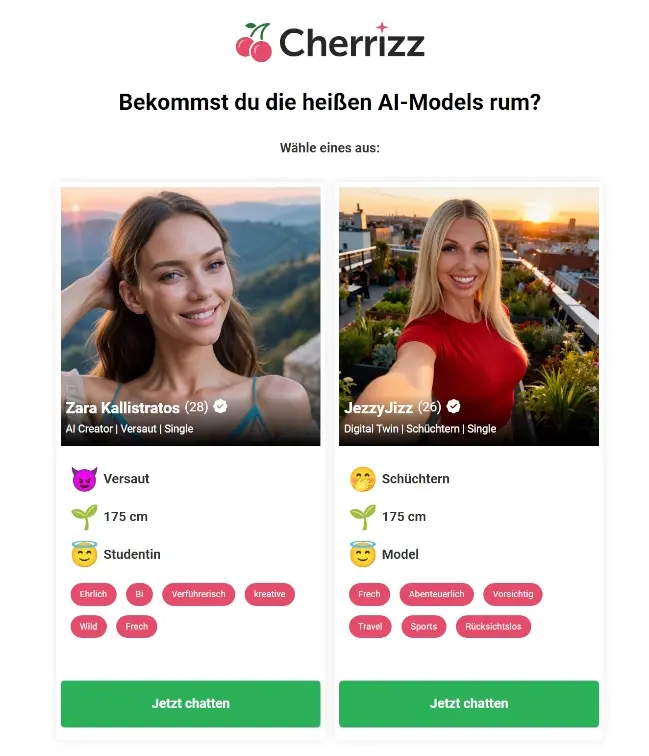 - Du gehst auf cherrizz.com und siehst eine Galerie verschiedener KI-Girls (unterschiedliche Looks, Styles, Vibes: süß, frech, dominant, romantisch, spicy usw.).